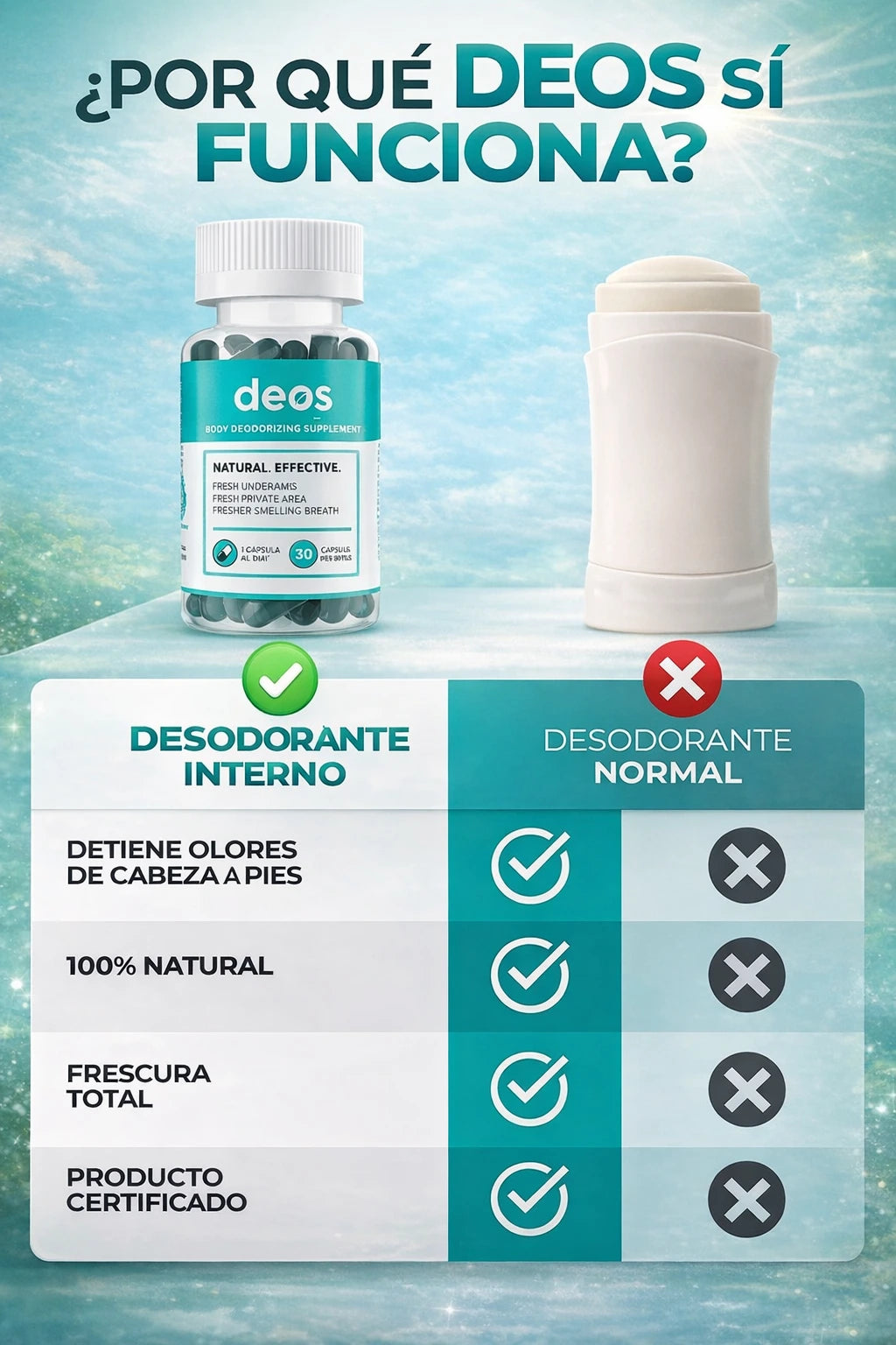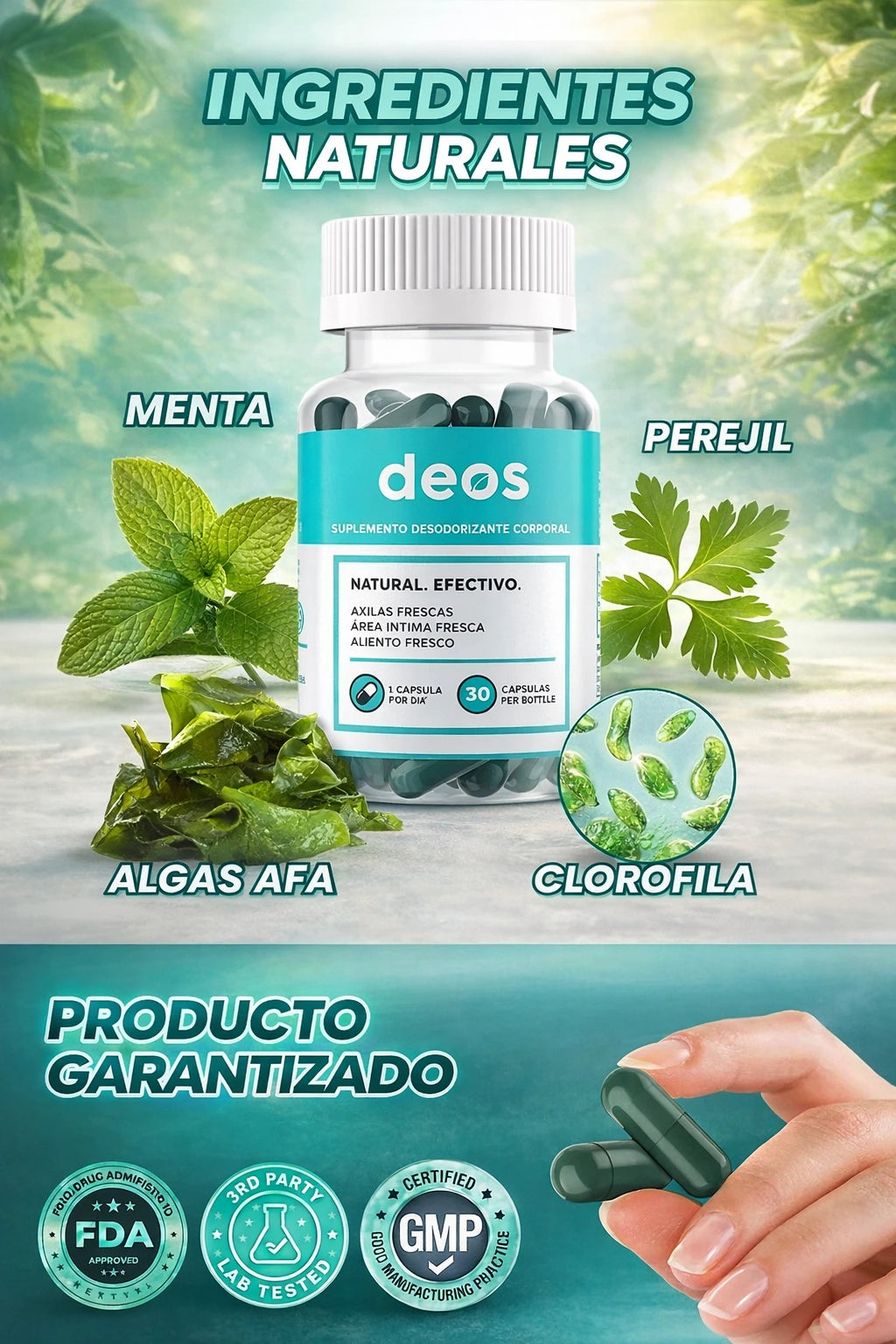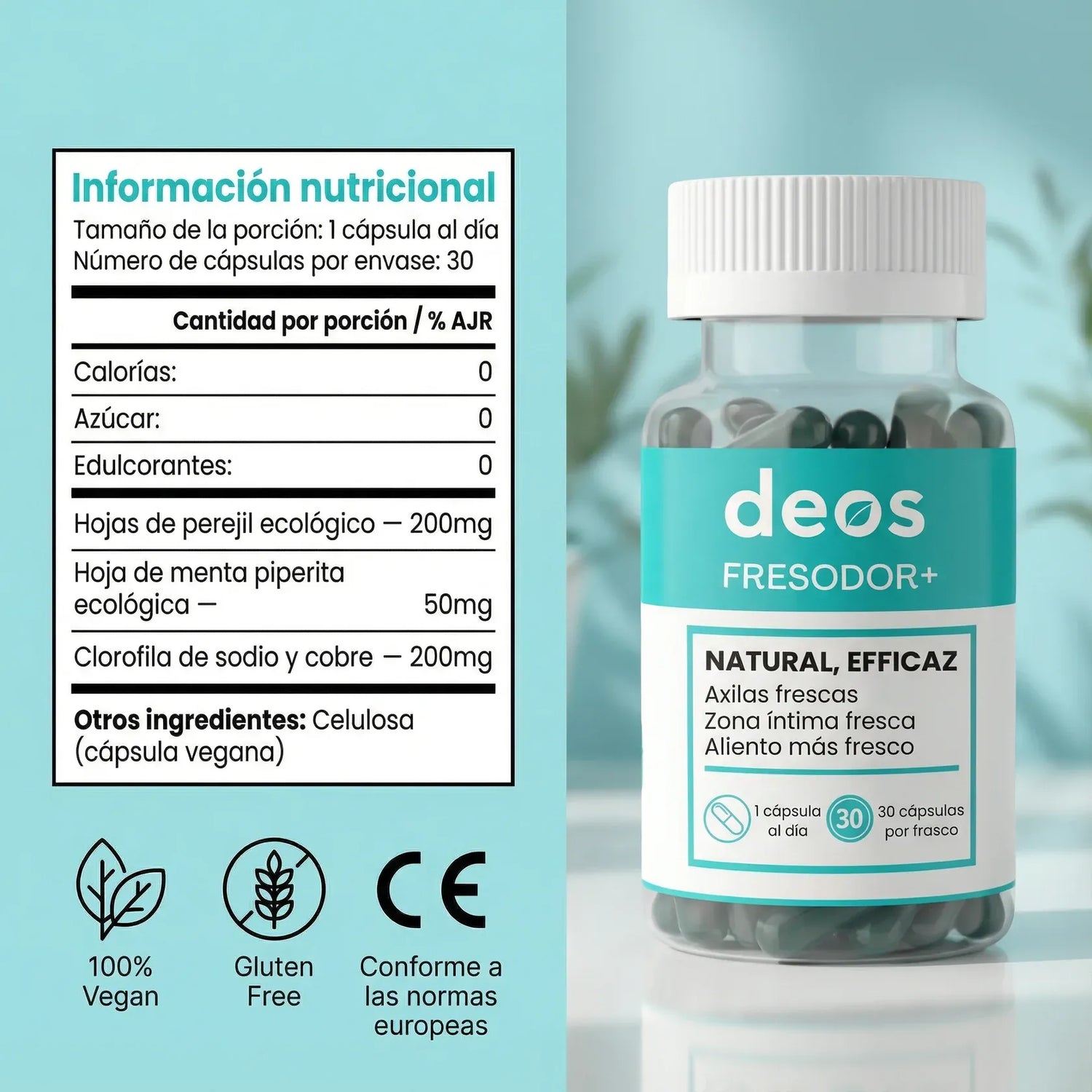 DEOS Clorofila trabaja desde el interior, neutralizando los olores desde su origen, mejorando digestión, piel y bienestar general de forma natural.