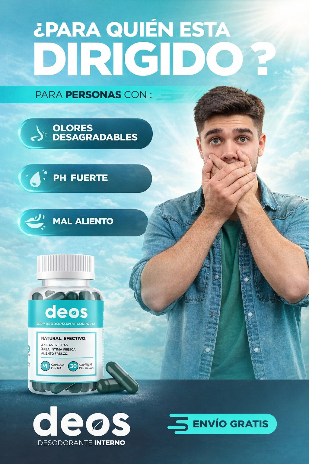 Ees un suplemento desodorizante corporal en cápsulas que ayuda a neutralizar el mal olor desde el interior. No tapa el olor con perfume, sino que apoya a tu cuerpo para que el sudor, el aliento y la zona íntima huelan más neutro.